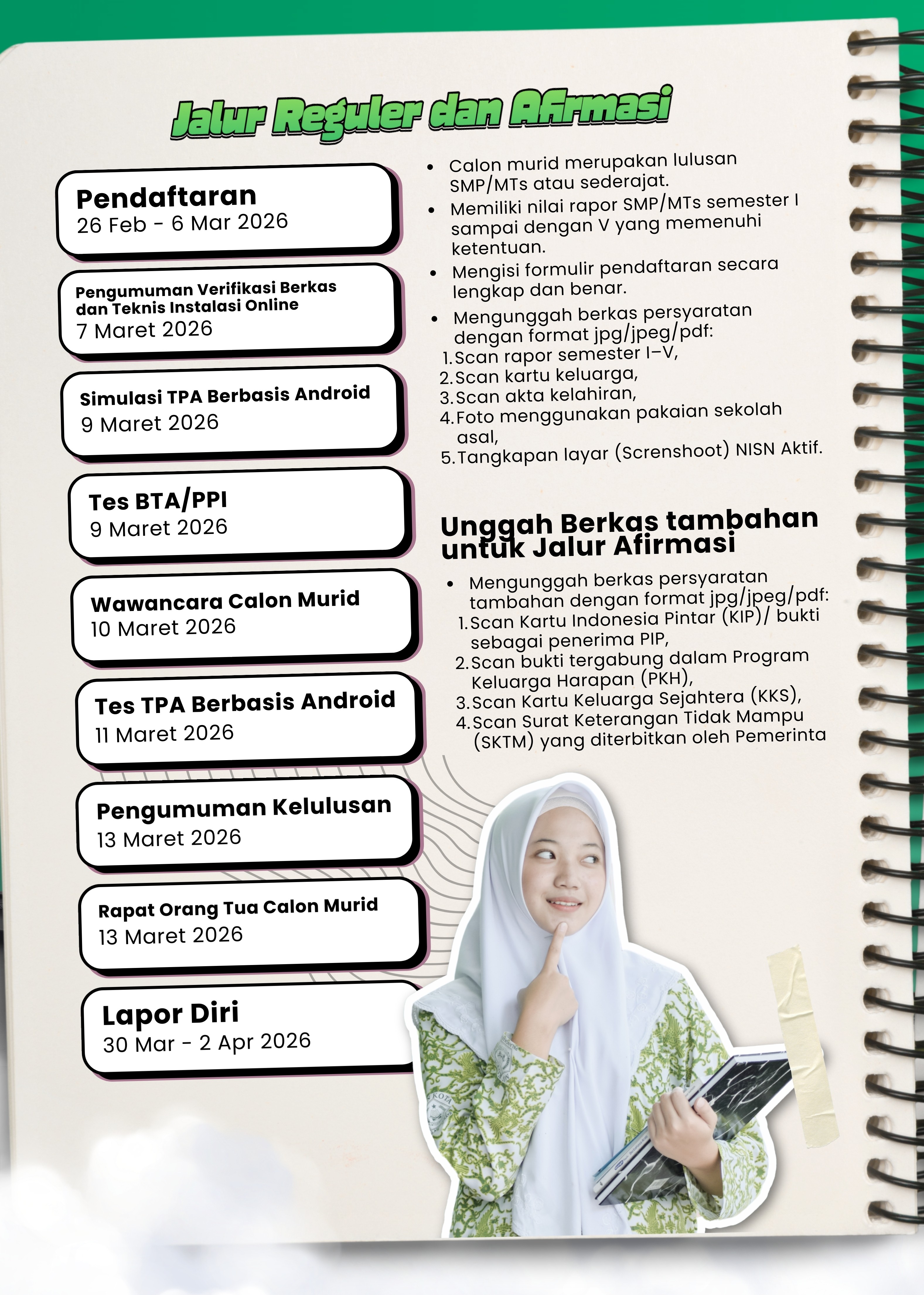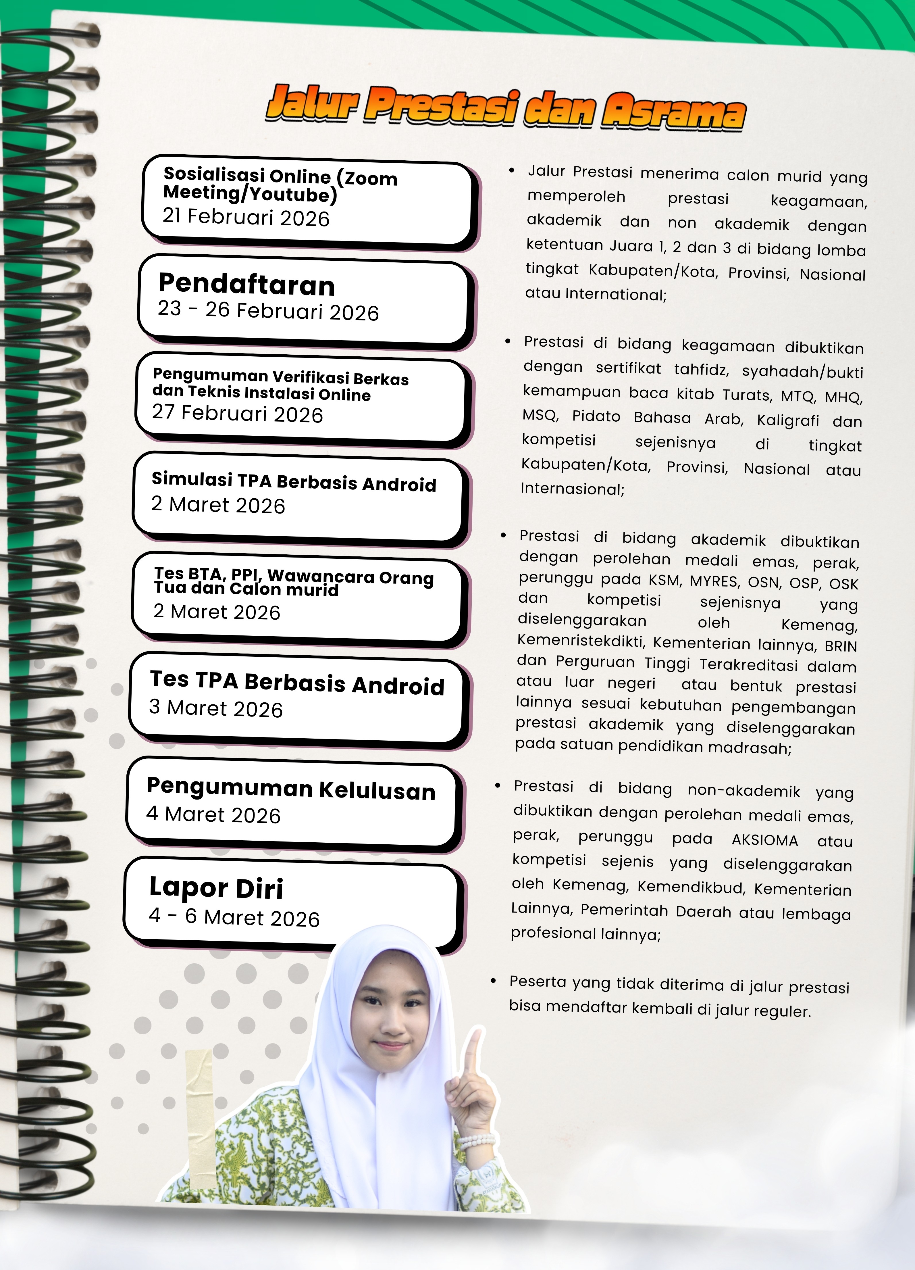 diperuntukkan bagi calon peserta didik yang bersedia mengikuti sistem pendidikan berbasis asrama (boarding). Melalui jalur ini, siswa akan mendapatkan pembinaan akademik dan karakter secara terintegrasi dalam lingkungan yang kondusif, terarah, dan disiplin.